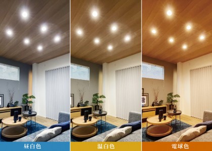 リビング天井のダウンライトは昼白色・温白色・電球色と色温度を調光でき、日中と夜間などシーンによって使い分けることが出来ます。