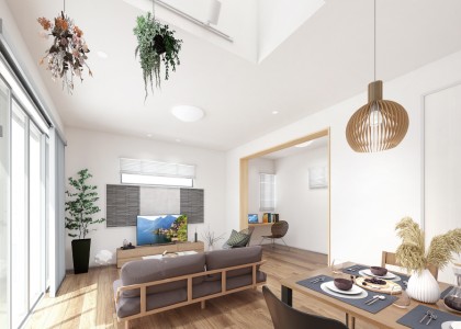 室内空間はリビングに陽光が入り込み明るい空間をつくってくれる吹抜け天井を全棟に設けました。