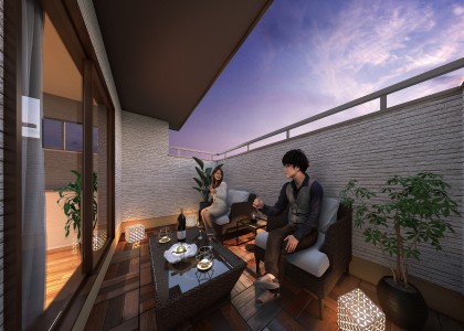 2階には、大空を贅沢に楽しめるラウンジバルコニーを設置。壁を高くすることで外からの目線を遮り、ゆっくりと空と風を感じリフレッシュ出来るスペースをつくりました。テレワークや家事の気分転換におすすめです。