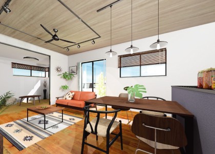 LDKの空間を広く取ったグランドリビングプラン。ダイニング横には造り付けのカウンターがあり、読書や勉強、パソコン作業などが出来るワークスペースになっています。