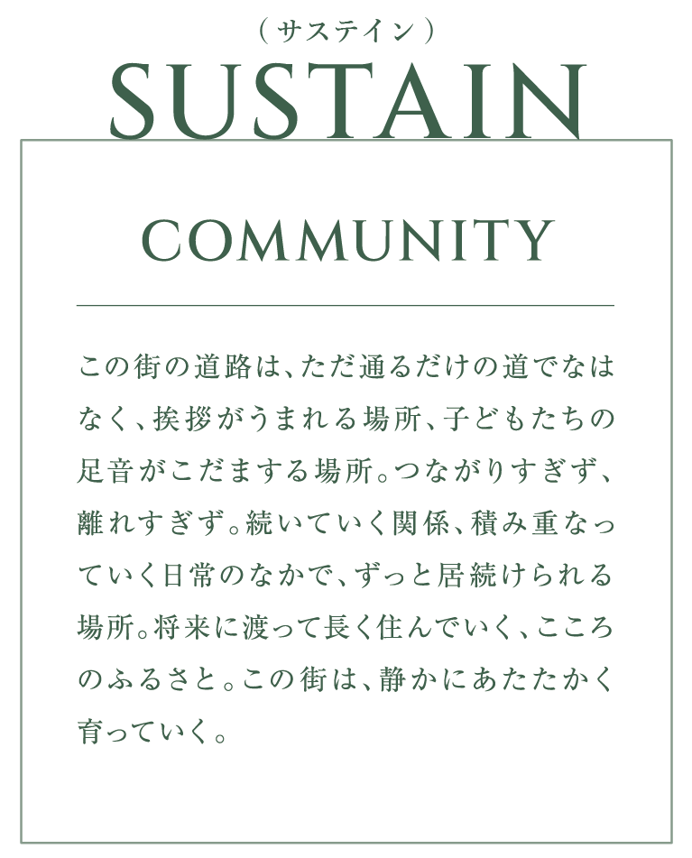 「サステイン」とは、単にエコという話ではなく、自然と共にあること。家族との時間が、無理なく心地よく続いていくこと。そして、街が10年、20年と愛されながら育っていくことを意味しています。北欧の暮らしは”続けていける心地よさ”をとても大事にしています。自然とともにある家。四季を楽しむ時間。モノをすぐには捨てず、直して使い続ける丁寧な姿勢。それは我慢や制限ではなく、ちゃんと続いていく暮らしの在り方への誇り。子どもたちの未来のことも、地域の風景のことも、目先ではなく、ずっと先を見つめて考える。サステインは、そんな暮らしの積み重ねの美しさを表す言葉です。