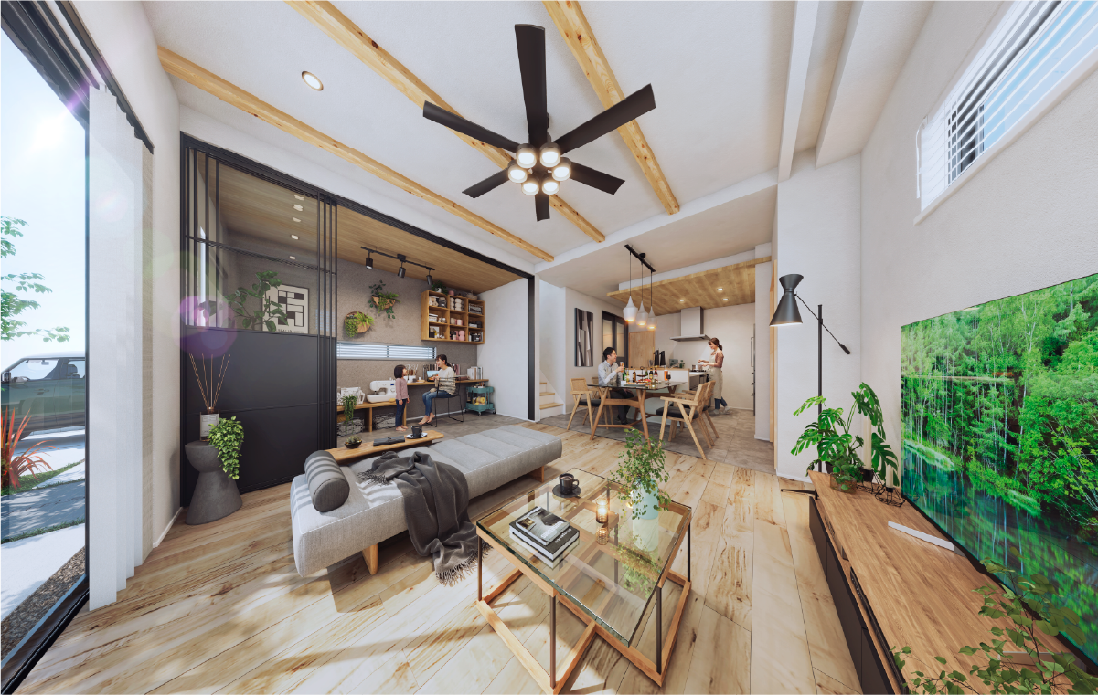 見上げるたびに深まる愛着。 木の温もりを感じる化粧梁がつくるリズムと開放感が、理想のリビングを叶えます。