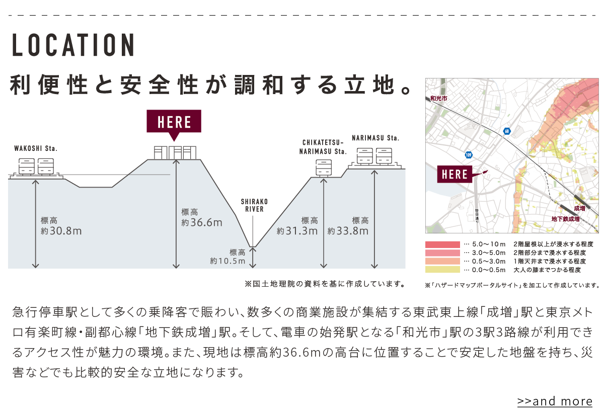 ■標高約36.6mの高台立地、洪水ハザードマップ非該当で災害リスクの少ない立地。