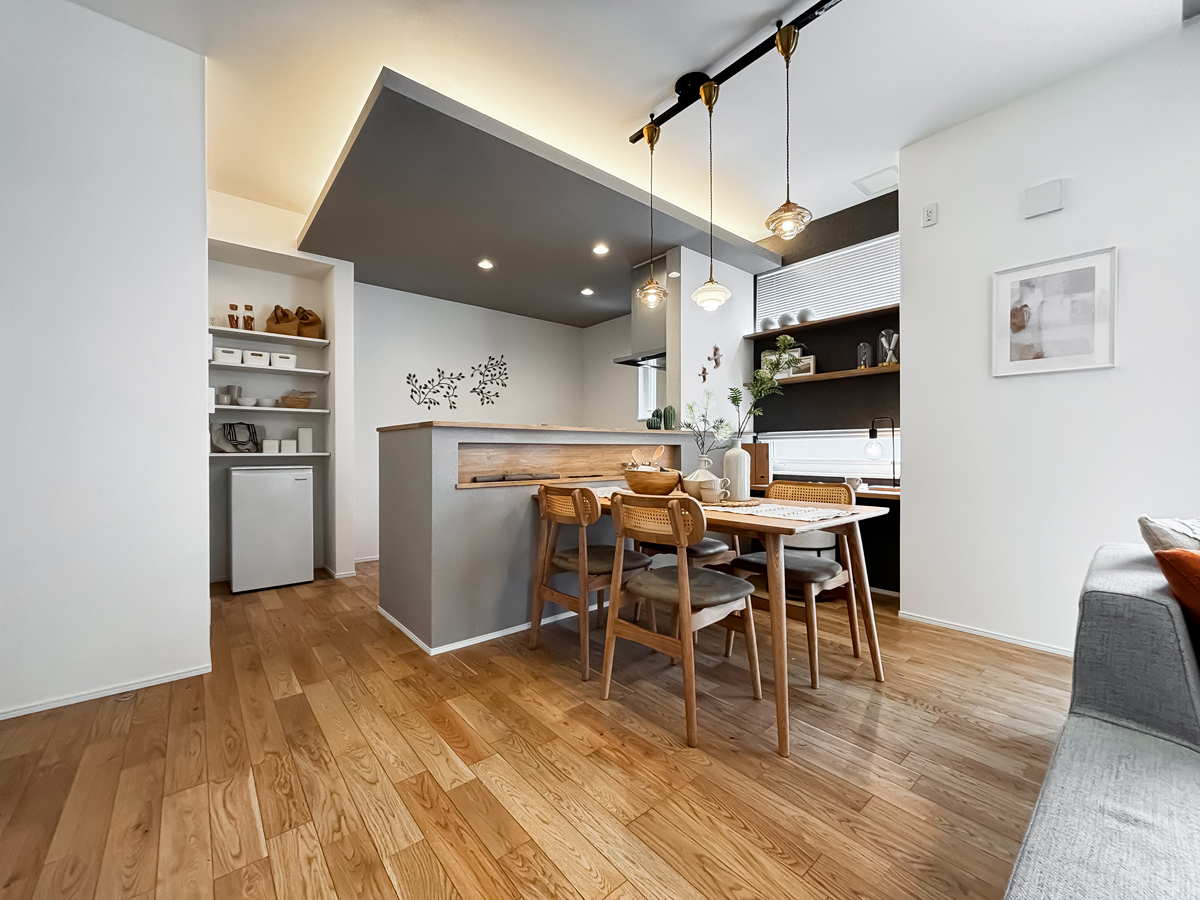 ダイニングはキッチン対面に位置し、食事の準備などがスムーズにできます。収納スペースもバッチリ。