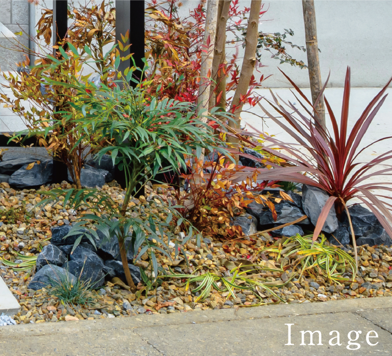 ゴツゴツとした大きな石と小さな石を組み合わせ、隙間に植物を植えることで、野趣あふれる自然の力強さが魅力です。