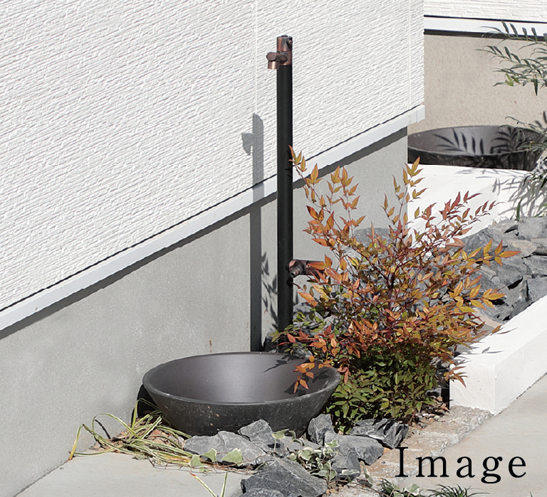 シンプルな細いラインの水栓と黒の陶器が、廻りの植栽に溶け込むシックなデザイン。植栽の水揚げ、洗車など、あると便利な気軽に使える立水栓です。