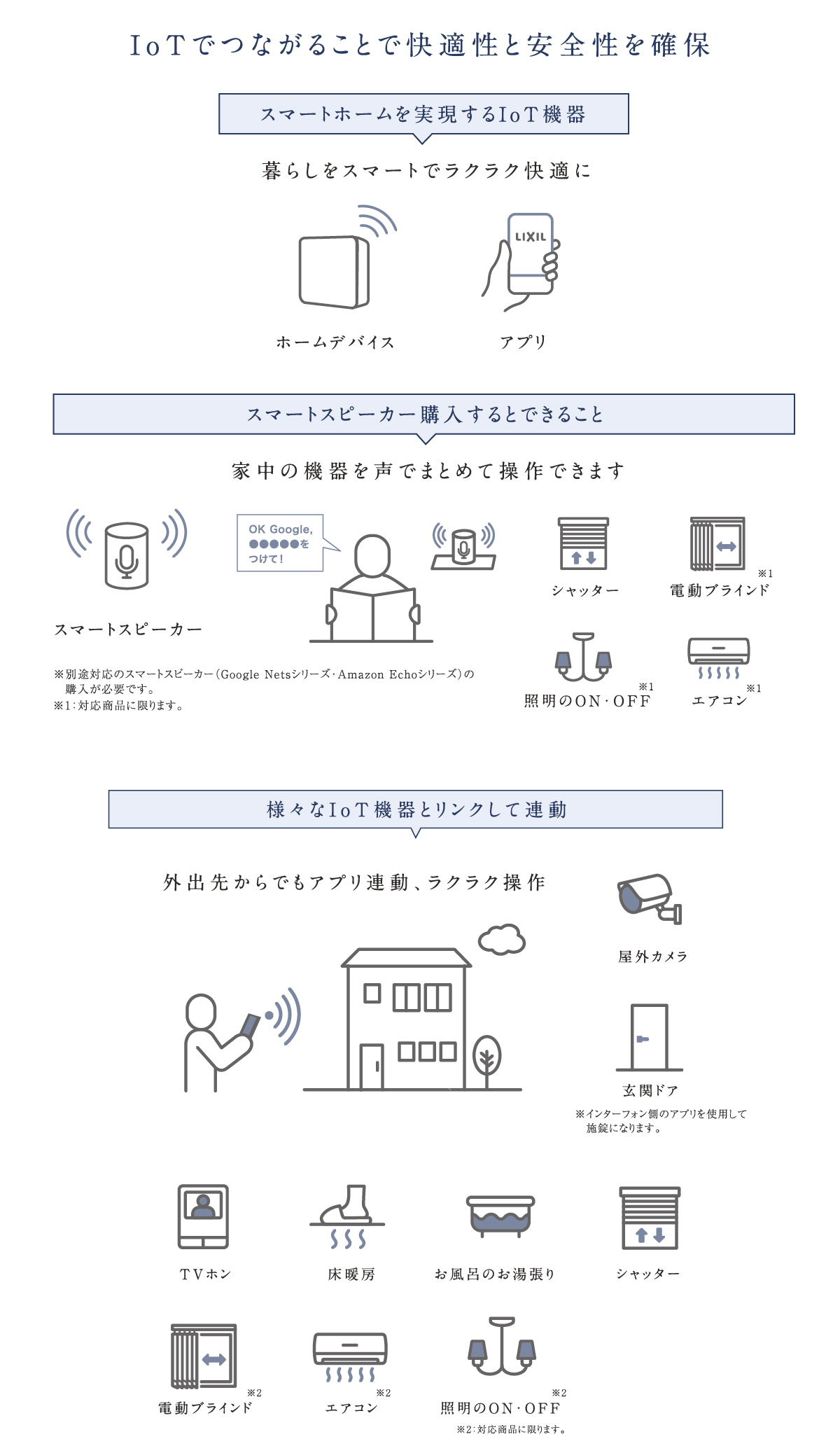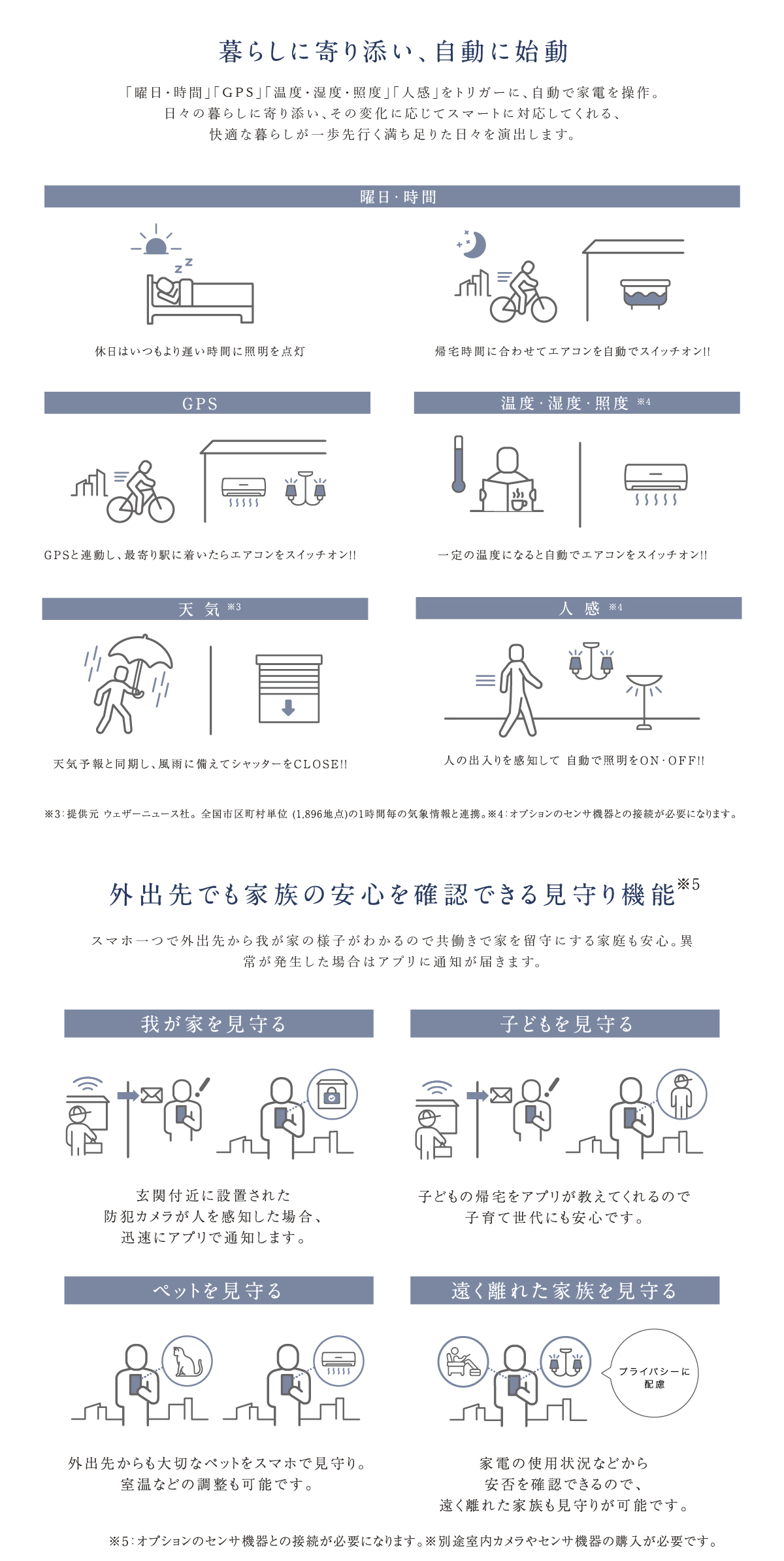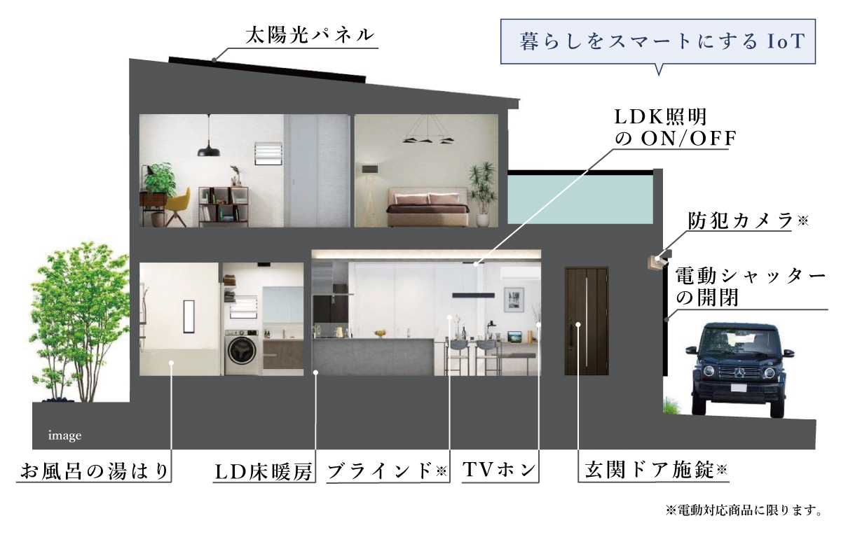 お目覚めからお出かけ、就寝まで住まう人の日常活動をきめ細かくサポートし、ワンランク上の利便性や快適性、そして安全性を叶えるIoTを装備しました。住空間の随所に施された一つひとつのアイテムが優れた機能で住まう人の負担を軽減しながら、暮らしの質を高め、スキマ時間を生み出します。