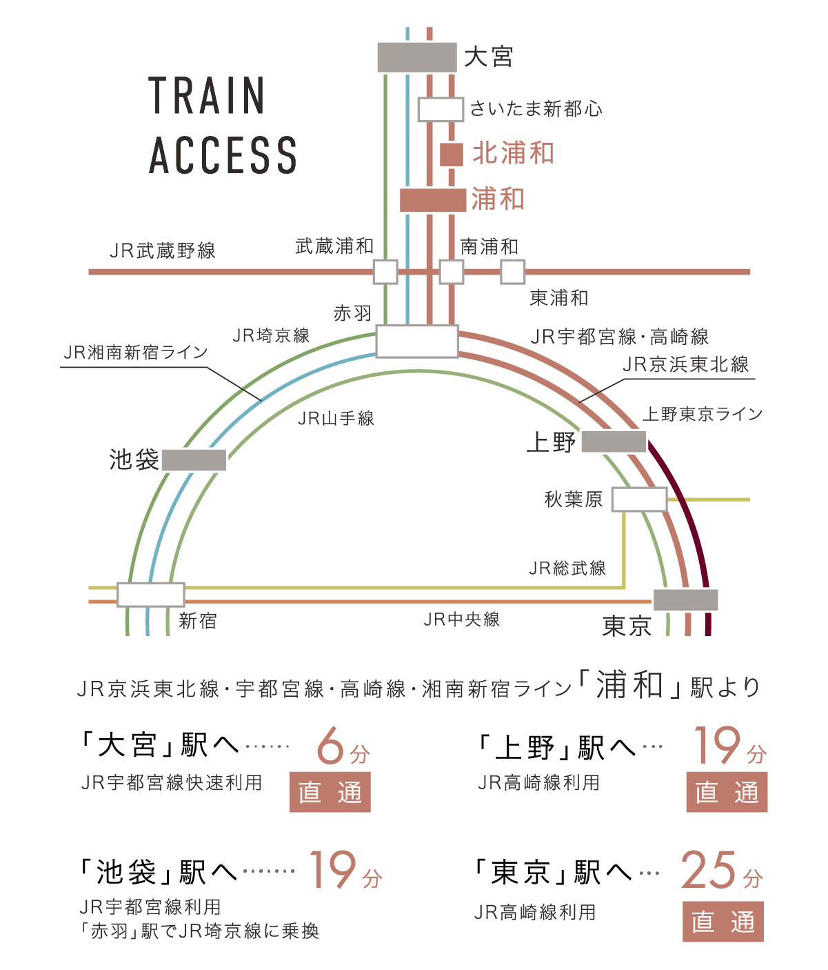 アクセス ●浦和駅より大宮駅まで【ラッシュ時: 6分 湘南新宿ライン(高崎行)利用。】【平常時: 5分 湘南新宿ライン快速(宇都宮行)利用。】